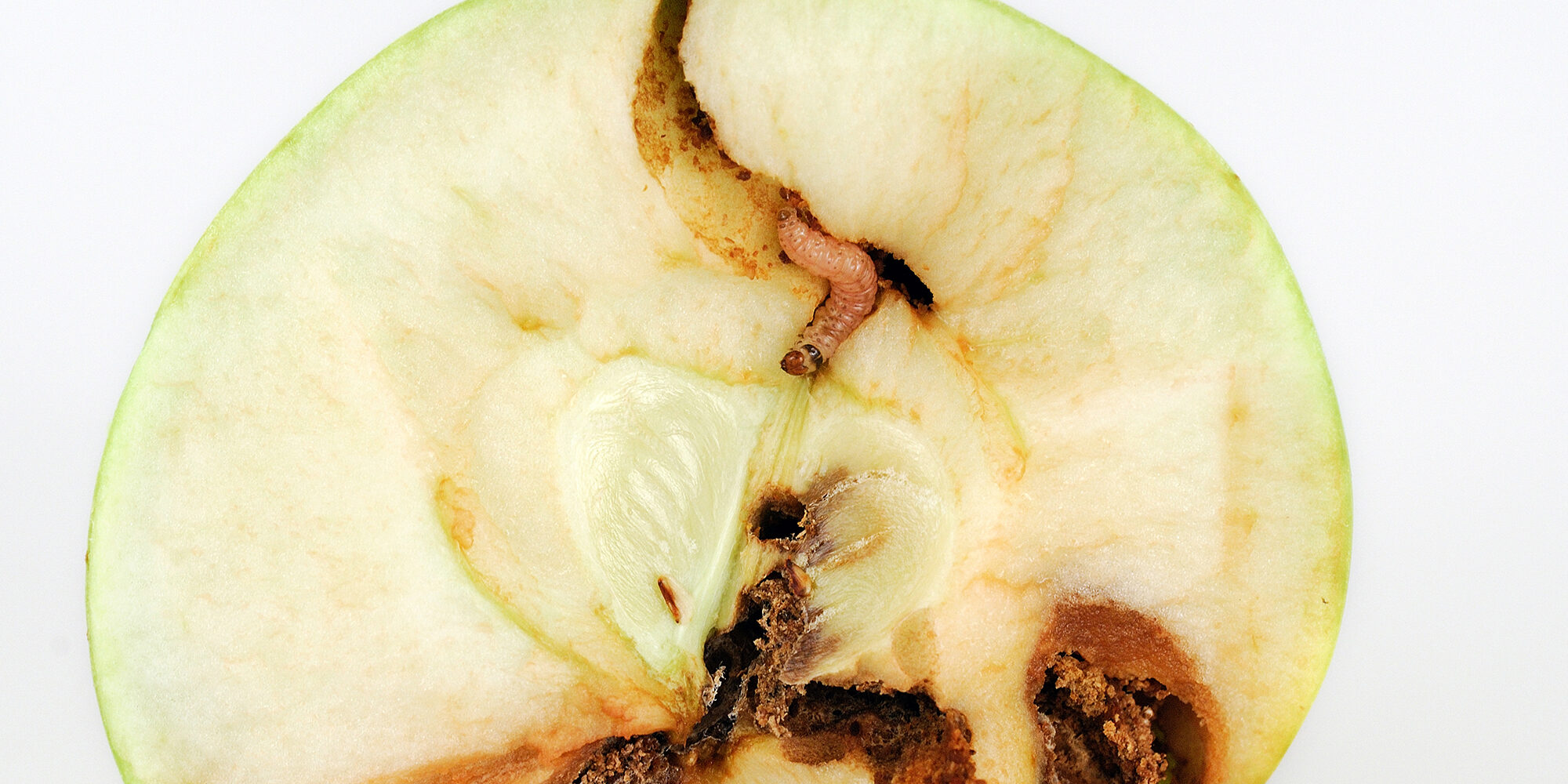 Der «Wurm» im Apfel ist kein eigentlicher Wurm, sondern die Larve des Apfelwicklerfalters (Cydia pomonella). Diese Falter legen ab Mai ihre Eier auf Blätter und kleine Früchte ab.